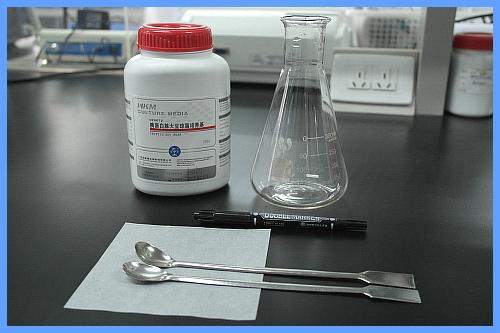 1、准备好(hǎo)干粉培养基、三角瓶、药勺、无菌平皿、油性笔等。首先在瓶說費身上标注好(hǎo)培养基的