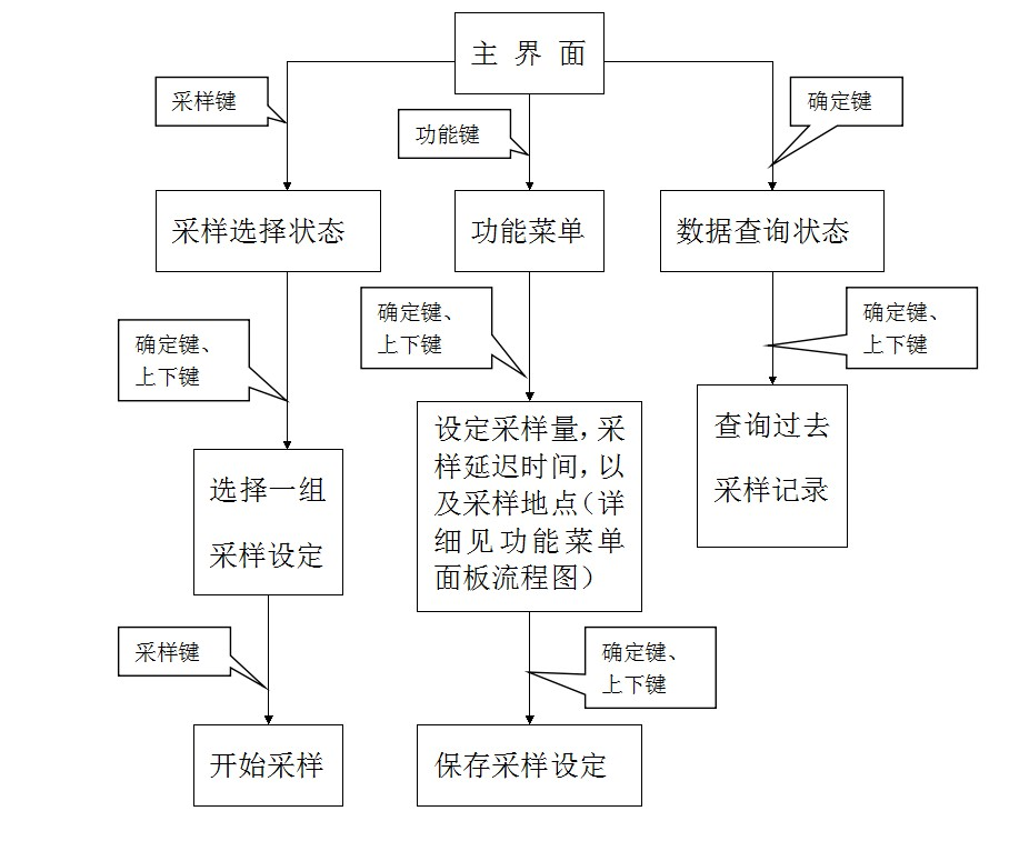 七、操作說(shuō)明1、采樣(yàng)器按键操作流程图: