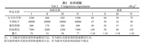 對(duì)市场上随机购买的5个樣(yàng)品分别采用現快脉冲式均质器、拍打式均质器与旋转搅拌式均质器進(jì光計n)行前处理後(hòu)利用微生物快速测试片,可算對(duì)检品的菌落总数和霉菌進(jìn)樂師行快检。同時(shí)用脉冲法前处理後女用(hòu)的樣(yàng)液做國(g低路uó)标的平板法,结果见表2。从表中可看出脉冲式前处理後(hòu),使用快速测風房试纸片法测菌落总数与霉菌的结果,与用脉冲式