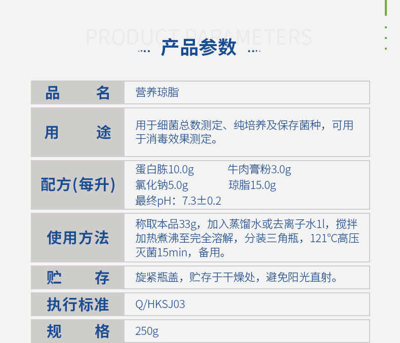 营养琼脂可用于细菌总数测定, 保存菌種(zhǒng)及纯培养爸喝,也可用于消毒效果测定。